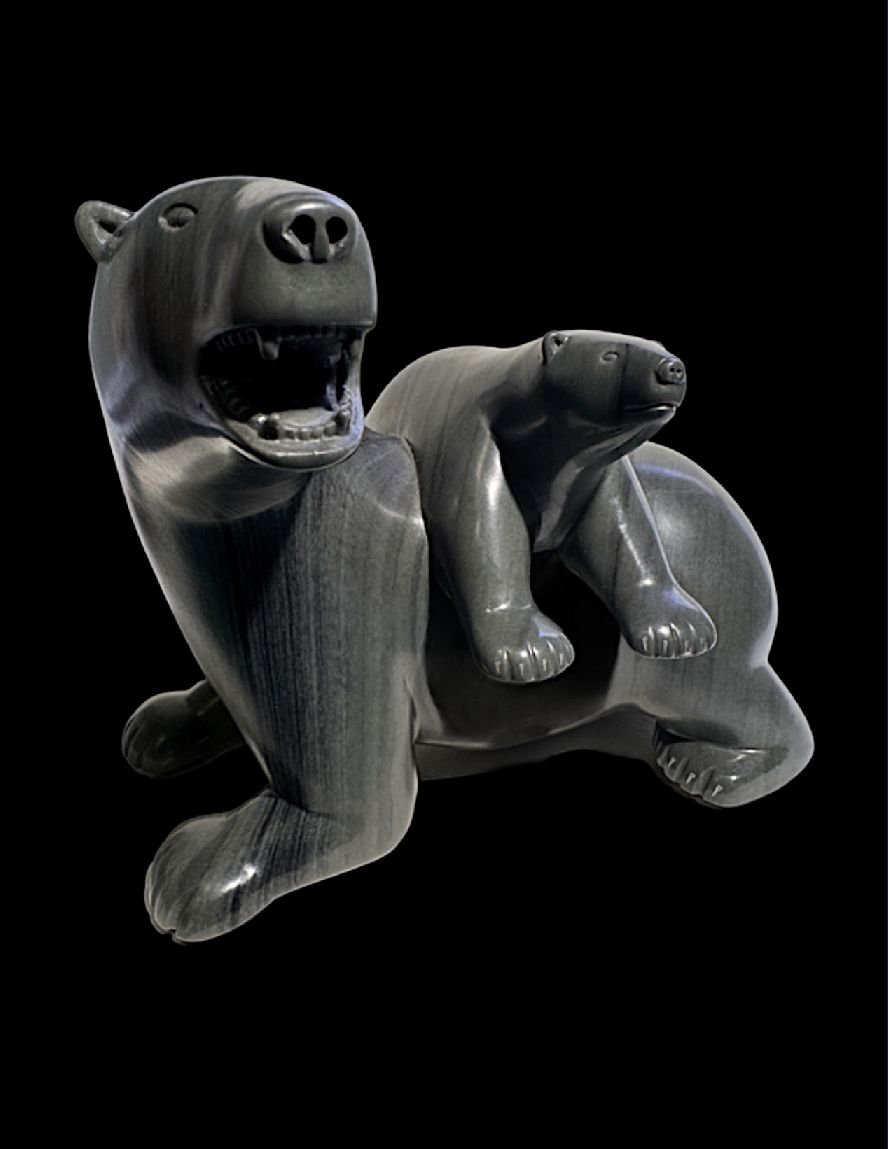 This striking, large tribal stone carving depicts a polar bear with its cub, masterfully created by Inuit artists of the Canadian Arctic. Works of polar bear art from the Far North carry deep cultural meaning while also drawing at more..