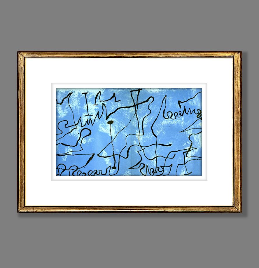 Description & Provenance: Joan Miró (Spanish, 1893–1983) — Untitled Blue, "Plate 3 – Untitled." This is a color lithograph on paper from a series of eight pieces, including the cover, published in 1956 by Jacques Prévert and Georges Ribemont-Dessaignes. The work is unsigned and shows folio fold marks. The paper measures approximately 9" x 15", and it is framed, with overall dimensions of approximately 16" x 22". The lithograph is in excellent condition. This piece is part of an early series of eight lithographs (including the cover, not shown) printed by Maeght. The series exemplifies Miró’s early explorations in color lithography.
