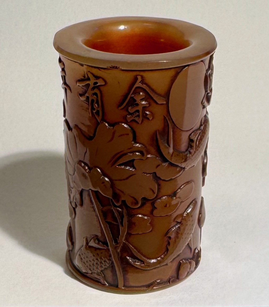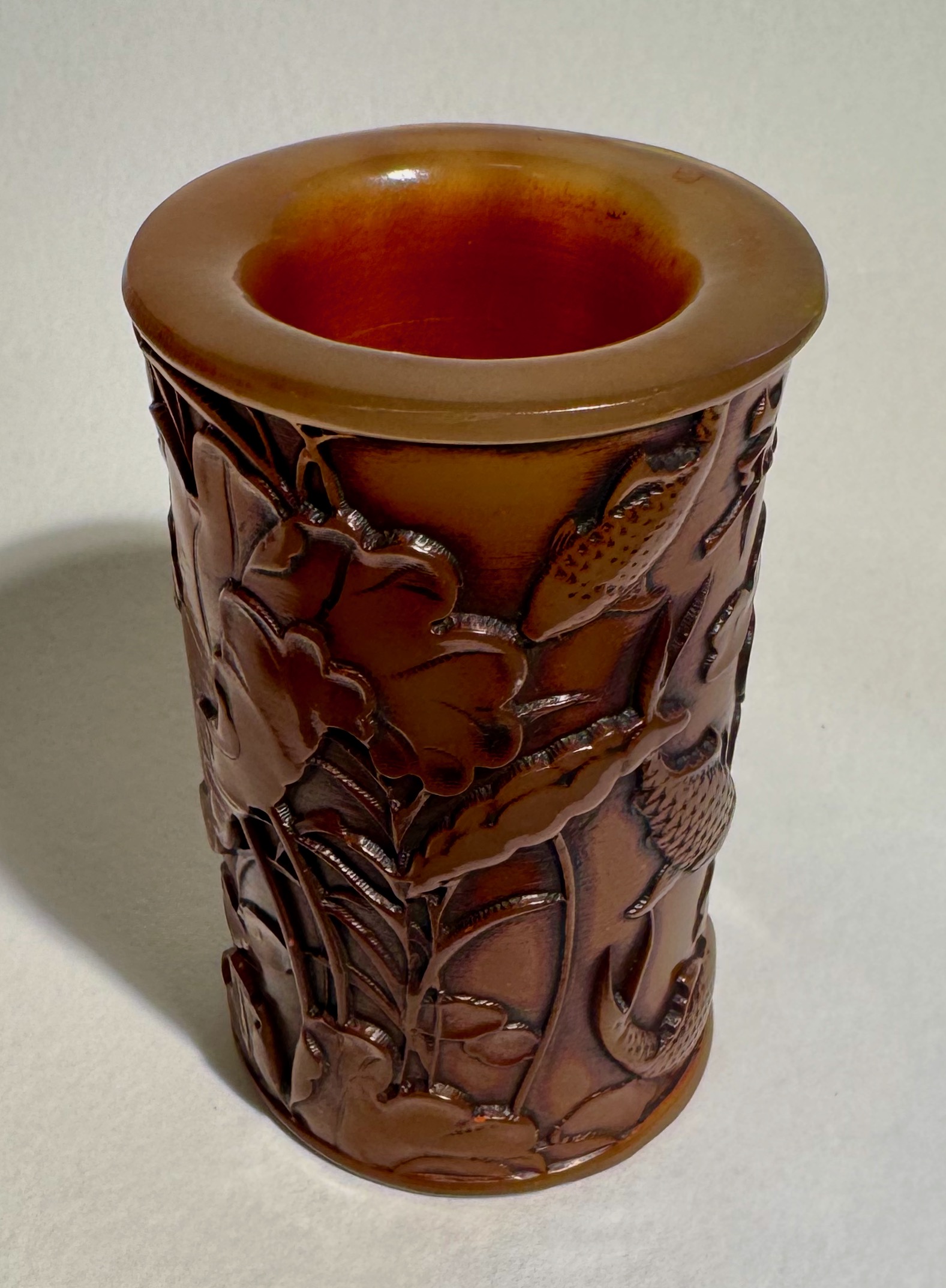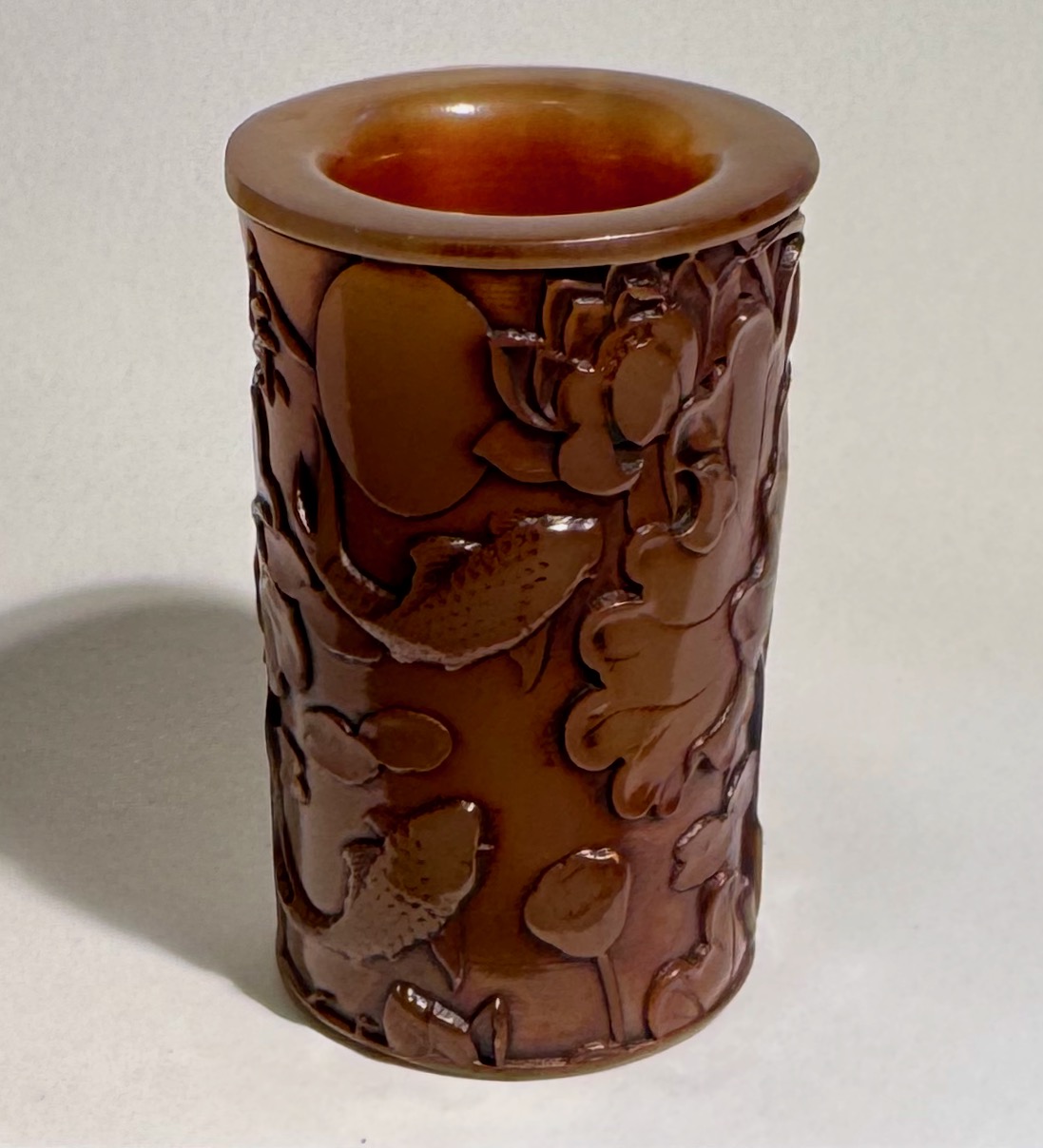 Antique hand-carved amber stone jade brush holder. This exquisite piece features finely detailed carvings by a Chinese craftsman depicting carp fish swimming through a watery, beautiful pond landscape that surrounds the container. The design is intricately carved on all five sides, showcasing exceptional artistry and craftsmanship. The stone is cold to the touch and shows natural transparency when held up to the light. Its exceptionally smooth surface indicates age and extended handling. The piece measures approximately 3 inches tall with a circumference of 1 7/8 inches. The History / For thousands of years, jade—alongside amber—has held deep cultural, spiritual, and artistic importance in China. Although true jade refers to nephrite or jadeite, many antique objects commonly described as “amber jade” are actually translucent nephrite, serpentine, or amber-toned stone prized for both beauty and symbolic meaning. As early as the Neolithic period (c. 5000–2000 BCE), jade was used in ritual objects, tools, and burial artifacts. By the time of the Ming Dynasty and later the Qing Dynasty, jade and translucent amber-toned stones became symbols of status, refinement, and moral virtue. Scholars, aristocrats, and court officials favored finely carved objects such as brush holders, seals, incense burners, and jewelry. Chinese craftsmen developed extraordinary lapidary skills, carving complex scenes—such as carp swimming in water, landscapes, clouds, and auspicious symbols—directly from solid stone. These carvings were not purely decorative; they conveyed philosophical and spiritual meaning rooted in Confucianism, Daoism, and Buddhism.