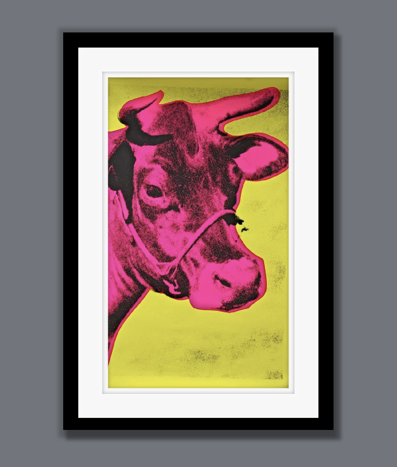Andy Warhol’s Cow wallpaper print, first produced in 1966, emerged at a pivotal moment when Pop Art was challenging traditional boundaries between fine art, design, and mass production. Conceived as wallpaper rather than a singular, precious artwork, Cow was originally installed in repeating panels for Warhol’s exhibition at Leo Castelli Gallery in New York, transforming the gallery walls themselves into the artwork. By selecting an ordinary, even banal subject and rendering it in unnaturally bright, high-contrast colors, Warhol emphasized repetition, commercial aesthetics, and the flattening of meaning that defined Pop Art. The work reflects Warhol’s embrace of industrial processes and his rejection of expressive depth, asserting that art could function like advertising—immediate, decorative, and endlessly reproducible. Today, individual sheets from the Cow wallpaper are regarded as iconic artifacts of 1960s Pop culture, representing Warhol’s radical redefinition of what constituted an artwork and how it could be experienced.