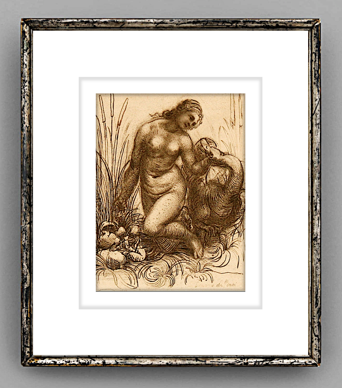 Antique Art Print: Study for the Kneeling Leda (c. 1505–1507) This antique art print is based on Study for the Kneeling Leda, a preparatory work related to the lost painting Leda and the Swan (c. 1503–1507) by Leonardo da Vinci. Artist: Leonardo da Vinci (Italian, 1452–1519) Date: c. 1503–1507 Technique: Pen and ink with wash over black chalk on paper Dimensions: 160 × 139 mm Type: Mythological graphic art Location: Devonshire Collection, Chatsworth In this study for the now-lost painting, Leonardo combines his mastery of draftsmanship with his deep knowledge of human anatomy—including his studies of human reproduction—and his lifelong fascination with movement and flight. The myth of Leda and her swan companion likely appealed to Leonardo’s subtle sense of wit and curiosity, allowing him to explore both sensuality and transformation within a classical narrative. Leonardo’s notebooks further reveal that he was also planning an alternative composition depicting Leda in a seated pose, underscoring his ongoing experimentation with form, gesture, and mythological subject matter. Lithography is a printmaking technique based on the natural repulsion between oil and water, developed in the late 18th century and widely adopted by artists in the 19th and 20th centuries. The artist draws directly onto a flat limestone surface or metal plate using a greasy crayon or ink, after which the surface is chemically treated so that the drawn areas retain ink while the non-image areas attract water and repel ink. When the stone or plate is moistened and rolled with oil-based ink, the ink adheres only to the drawn image, which is then transferred onto paper under pressure. Lithography is prized for its ability to capture the immediacy, subtlety, and expressive quality of drawing, allowing for rich tonal variation and fluid, painterly effects.