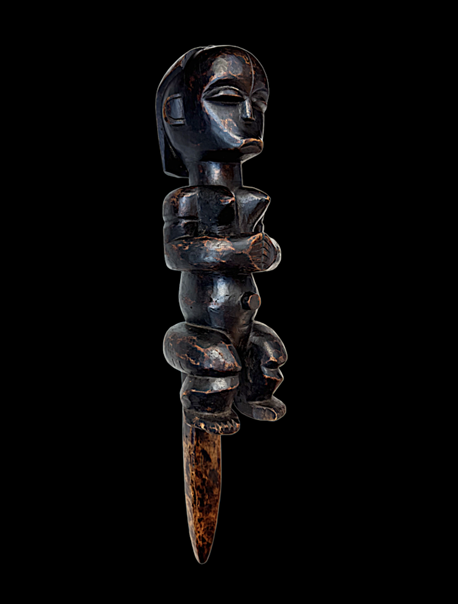 Most African sculpture was historically in wood and other natural materials that have not survived from earlier than a few centuries ago; older pottery figures can be found from a number of areas. human figures, often highly stylized and in vast variety of styles. Sculpture is most common among "groups of settled cultivators in the areas drained by the Niger and Congo rivers. Direct images of deities are relatively infrequent. These African wooden carved female fertility sculptures, particularly those from the Fang people of Gabon, were created as powerful spiritual and cultural objects rather than decorative art. They were made to honor ancestors, protect family lineage, and encourage fertility, prosperity, and continuity within the community. Often used in ritual contexts, these figures embodied idealized human forms meant to house ancestral spirits, serving as intermediaries between the living and the spiritual world. Their stylized features and deliberate abstraction conveyed strength, balance, and spiritual authority, reflecting the Fang belief that ancestral presence was essential for guidance, protection, and the well-being of future generations. These full-figured, nude female sculptures were carved this way because the human body—especially the female form—was seen as a direct symbol of fertility, life, and continuity. In many African cultures, including the Fang of Gabon, nudity was not sexualized but understood as natural and powerful, emphasizing motherhood, vitality, and the ability to sustain future generations. The exaggerated proportions—such as rounded hips, abdomen, and breasts—highlight abundance, health, and reproductive strength, qualities essential to the survival of the community. By presenting the figure unclothed and idealized, the sculptor removed social status or individuality, allowing the figure to function as a universal spiritual symbol tied to ancestry, protection, and the cycle of life rather than as a portrait of a specific person.