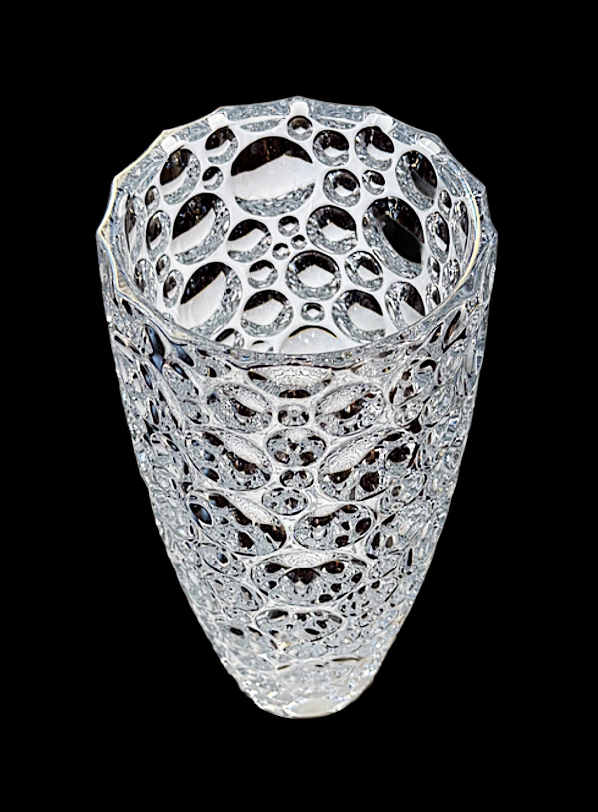 This stunning Bohemian bubble art glass vase from the Czech Republic is a superb example of contemporary Czech glassmaking, a tradition celebrated for its clarity, weight, and refined craftsmanship. Bubble and button glass remains one of the most popular and sought-after styles today, admired by designers for its exceptional optical quality and reflective brilliance. Crafted in clear lead crystal, this unmarked vase from the Coin product line stands approximately 13½–14 inches tall and features a beautifully executed spherical cut design. Varying sizes of raised and recessed bubbles create a striking geometric composition, giving the vase a dynamic, shifting visual effect. When viewed through the glass, the bubbles refract light in a way that resembles delicate champagne fizz, making the piece endlessly fascinating to observe. The vase is exceptionally heavy, weighing approximately 10 pounds, with a substantial presence. Measurements include a 3⅛-inch base and a 5⅜-inch top opening, allowing it to comfortably display long-stem roses, hollyhocks, or other tall floral arrangements. It is equally captivating when used with a taper candle, as the flickering light dances across the bubble surface. This exquisite crystal vase is in perfect condition and pairs beautifully with other crystal or glass elements in both modern and classic interiors. An elegant statement piece that combines sculptural form, optical beauty, and the enduring legacy of Czech Bohemian glass. Bohemian bubble glass has its roots in the centuries-old glassmaking tradition of Czechoslovakia, a region internationally renowned for its mastery of crystal and decorative glass. Beginning in the early 20th century and gaining major popularity in the mid-century modern era, Czech glassmakers perfected techniques that combined heavy lead crystal with sculptural, optical designs. Bubble glass is created by blowing or molding molten glass and then cutting, pressing, or carving rounded “bubble” or “lens” forms into the surface. These bubbles refract and magnify light, creating a dynamic visual effect that changes with movement and illumination. Its popularity stems from this unique interaction with light, the substantial weight and clarity of Czech crystal, and its ability to bridge modern and classic design. Designers and collectors continue to value Bohemian bubble glass for its sculptural beauty, durability, and the exceptional craftsmanship that reflects the innovation and artistic legacy of Czechoslovakian glassmaking.