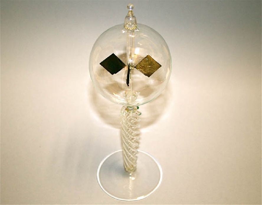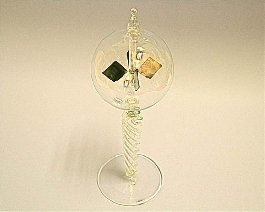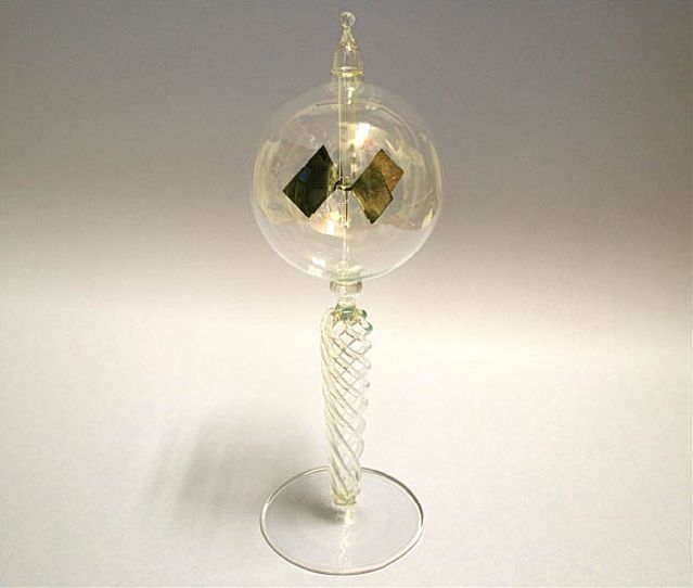 Venetian Radiometer, Hand-Blown Glass Weather Tool. A radiometer demonstrates the energy carried by light, and how that energy can be converted into heat. Experience this sphere powered by the sun! The vanes in the radiometer are alternately dark and light in color. When the light strikes the lighter vanes it reflects the rays while the darker vanes absorb the rays. The stronger the light, the more energy there is causing the vanes to spin faster. The radiometer vanes turn toward the light side and away from the dark side because of heated air. (The heat is generated from the light energy absorbed by the dark side of the vane.) A fascinating and beautiful science experiment, a perfect gift for brainy-types.