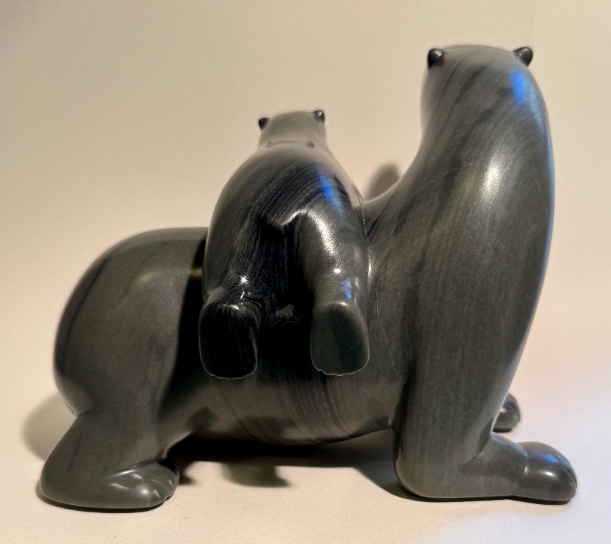 Description & Provenance: This striking, large tribal stone carving depicts a polar bear with its cub, masterfully created by Inuit artists of the Canadian Arctic. Works of polar bear art from the Far North carry deep cultural meaning while also drawing attention to the growing environmental threats these magnificent animals face. As climate change continues to endanger their survival, sculptures such as this remind us of our shared responsibility to raise awareness and take action. The sculpture is made of gray slate stone and measures approximately 7 × 6 inches. It is signed by the artist. The Inuit—meaning “the People” in the Inuktitut language—live across the northernmost regions of North America, from Alaska in the west, across the Canadian Arctic coastline and islands, to Greenland in the east. Today, approximately 65,000 Inuit live within Canada. Inuit art is as diverse as the vast land and sea that sustain their way of life. Each piece is shaped by tradition, environment, and the natural materials available in the Arctic, resulting in works that are both culturally rich and visually powerful. In Arctic tradition, the creation of sculpture is deeply spiritual, beginning with the careful “choosing” of the stone, which many Inuit artists believe already holds the spirit of the form within it. The artist’s role is not to invent the image, but to release it from the stone through carving, guided by intuition, respect for nature, and ancestral knowledge. Materials such as slate, serpentine, and soapstone are selected not only for their workability, but for their spiritual connection to the land. Within this tradition, the polar bear is one of the most powerful symbols in Arctic culture, representing strength, survival, leadership, and the sacred balance between humans and nature. When depicted with a cub, the symbolism deepens to include protection, maternal care, continuity of life, and the responsibility to safeguard future generations—both of the animal world and of the people themselves.