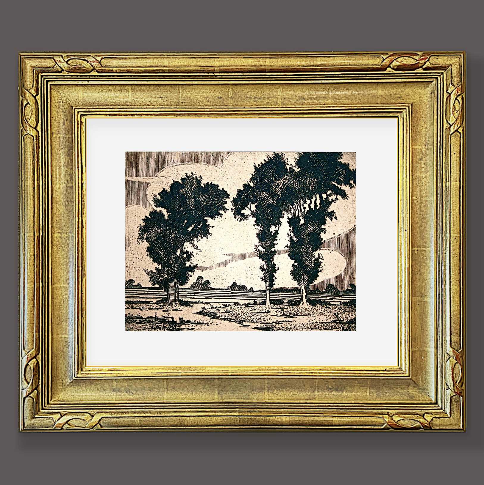 Antique Metal Engraving Landscape Print of Three Large Trees