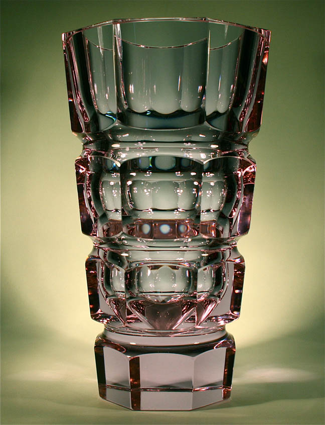 These new designers decided to adopt the style of the art deco design. genuine cased, mouth-blown, hand-cut, lead crystal vase. This is a heavy cut crystal vase in a beautiful purple crystal glass. Crystal’s represents the traditional timeless beauty of cased crystal. These majestic pieces of master craftsmen feature cuts around the bowl vase. The design is varied by a beautiful scallop cutting. The sculptured and faceted cuts underlines the elegance of this light purple glass. This look and design was a great crystal success. The popular art deco design proposes a unique look to timeless quality.