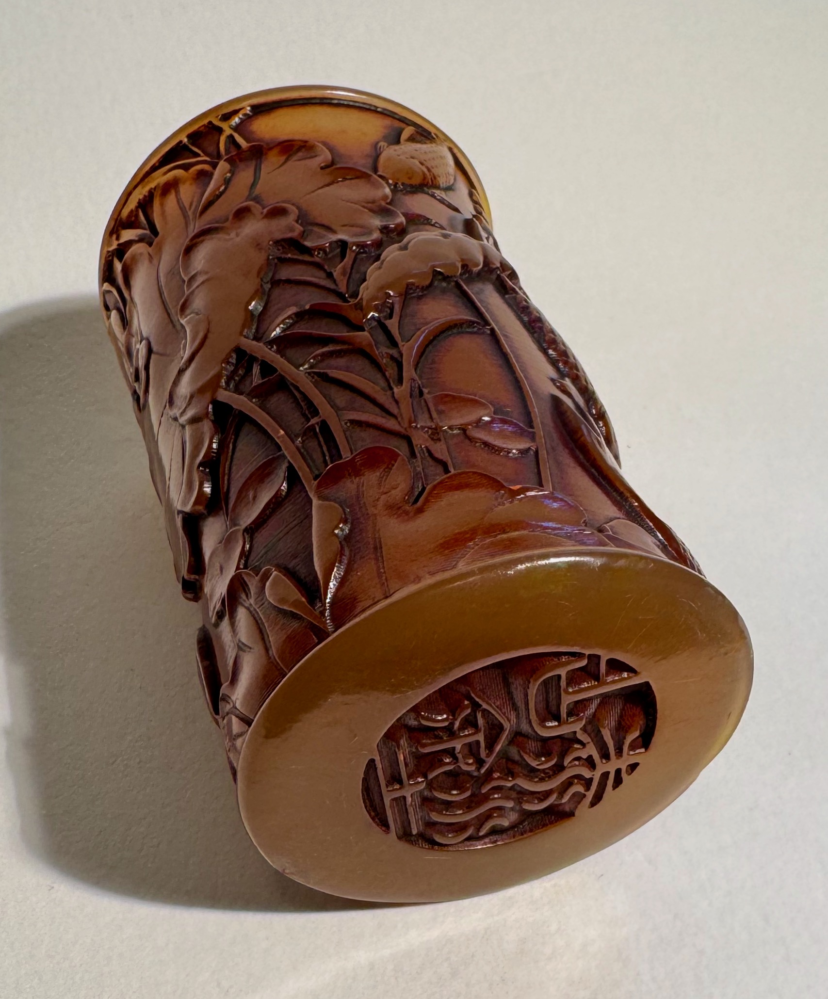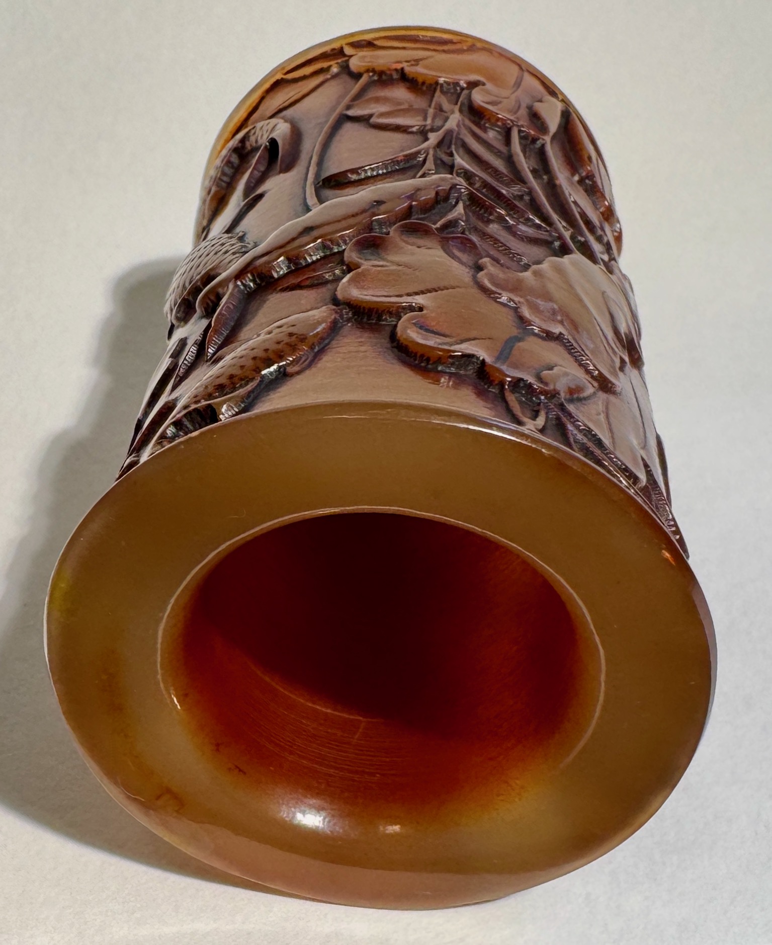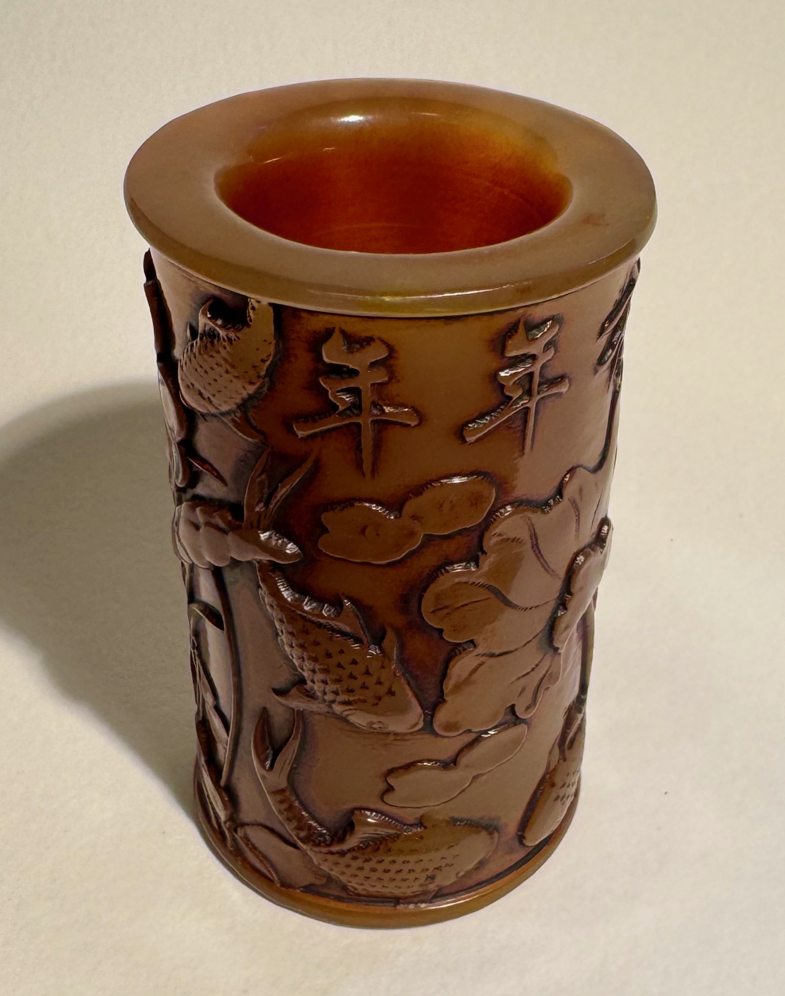 Antique hand-carved amber stone jade brush holder. This exquisite piece features finely detailed carvings by a Chinese craftsman depicting carp fish swimming through a watery, beautiful pond landscape that surrounds the container. The design is intricately carved on all five sides, showcasing exceptional artistry and craftsmanship. The stone is cold to the touch and shows natural transparency when held up to the light. Its exceptionally smooth surface indicates age and extended handling. The piece measures approximately 3 inches tall with a circumference of 1 7/8 inches. The History / For thousands of years, jade—alongside amber—has held deep cultural, spiritual, and artistic importance in China. Although true jade refers to nephrite or jadeite, many antique objects commonly described as “amber jade” are actually translucent nephrite, serpentine, or amber-toned stone prized for both beauty and symbolic meaning. As early as the Neolithic period (c. 5000–2000 BCE), jade was used in ritual objects, tools, and burial artifacts. By the time of the Ming Dynasty and later the Qing Dynasty, jade and translucent amber-toned stones became symbols of status, refinement, and moral virtue. Scholars, aristocrats, and court officials favored finely carved objects such as brush holders, seals, incense burners, and jewelry. Chinese craftsmen developed extraordinary lapidary skills, carving complex scenes—such as carp swimming in water, landscapes, clouds, and auspicious symbols—directly from solid stone. These carvings were not purely decorative; they conveyed philosophical and spiritual meaning rooted in Confucianism, Daoism, and Buddhism.