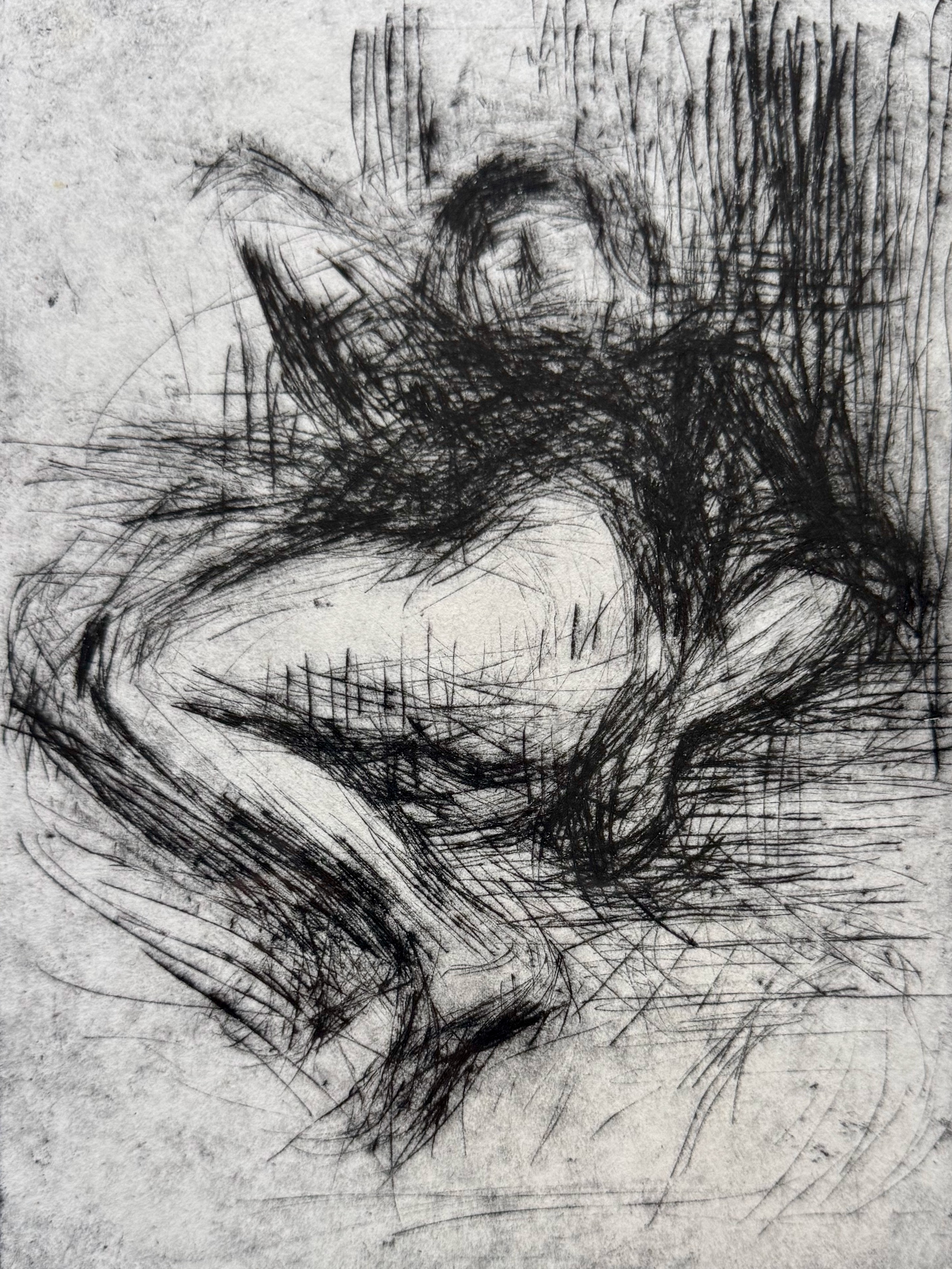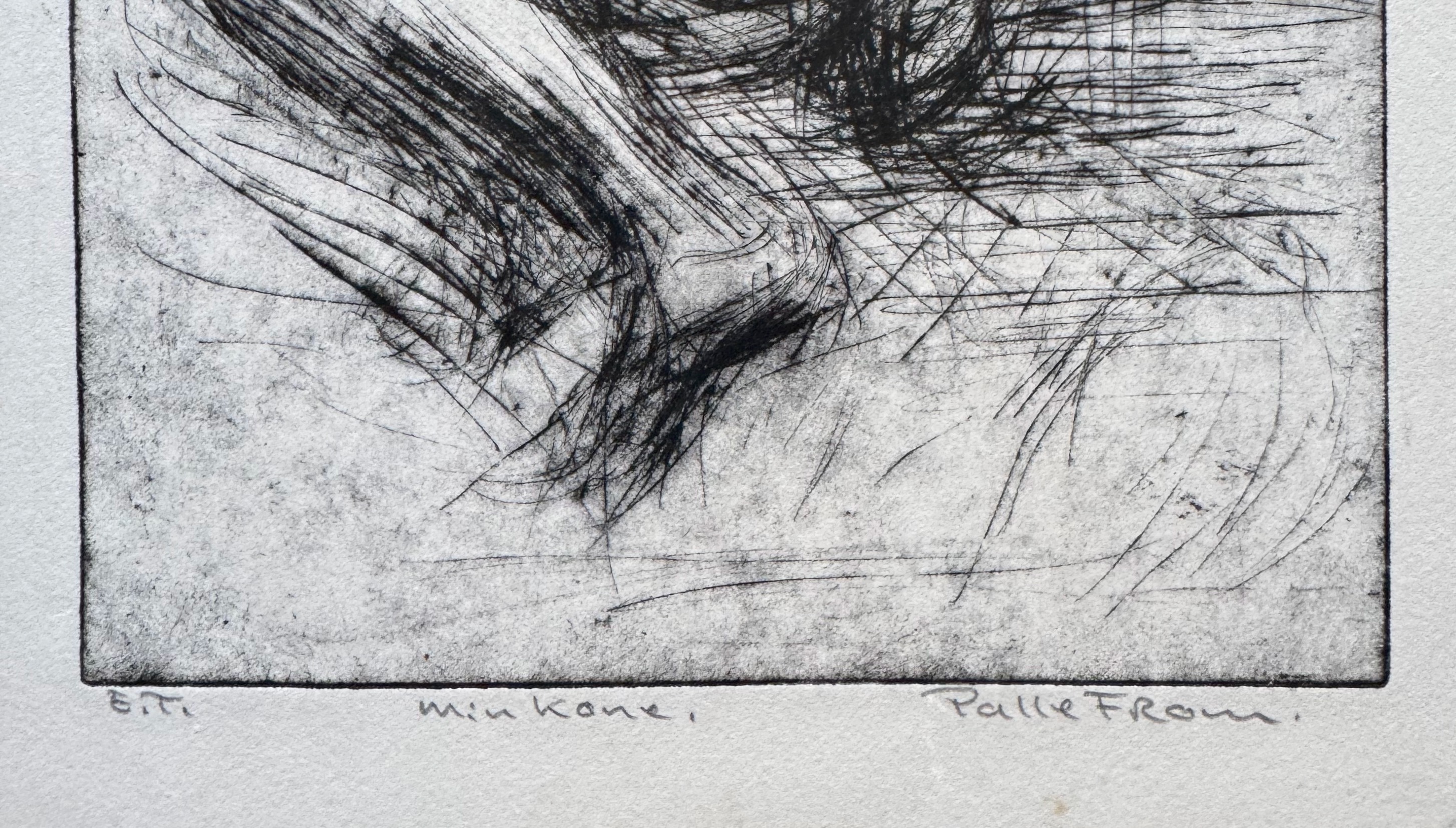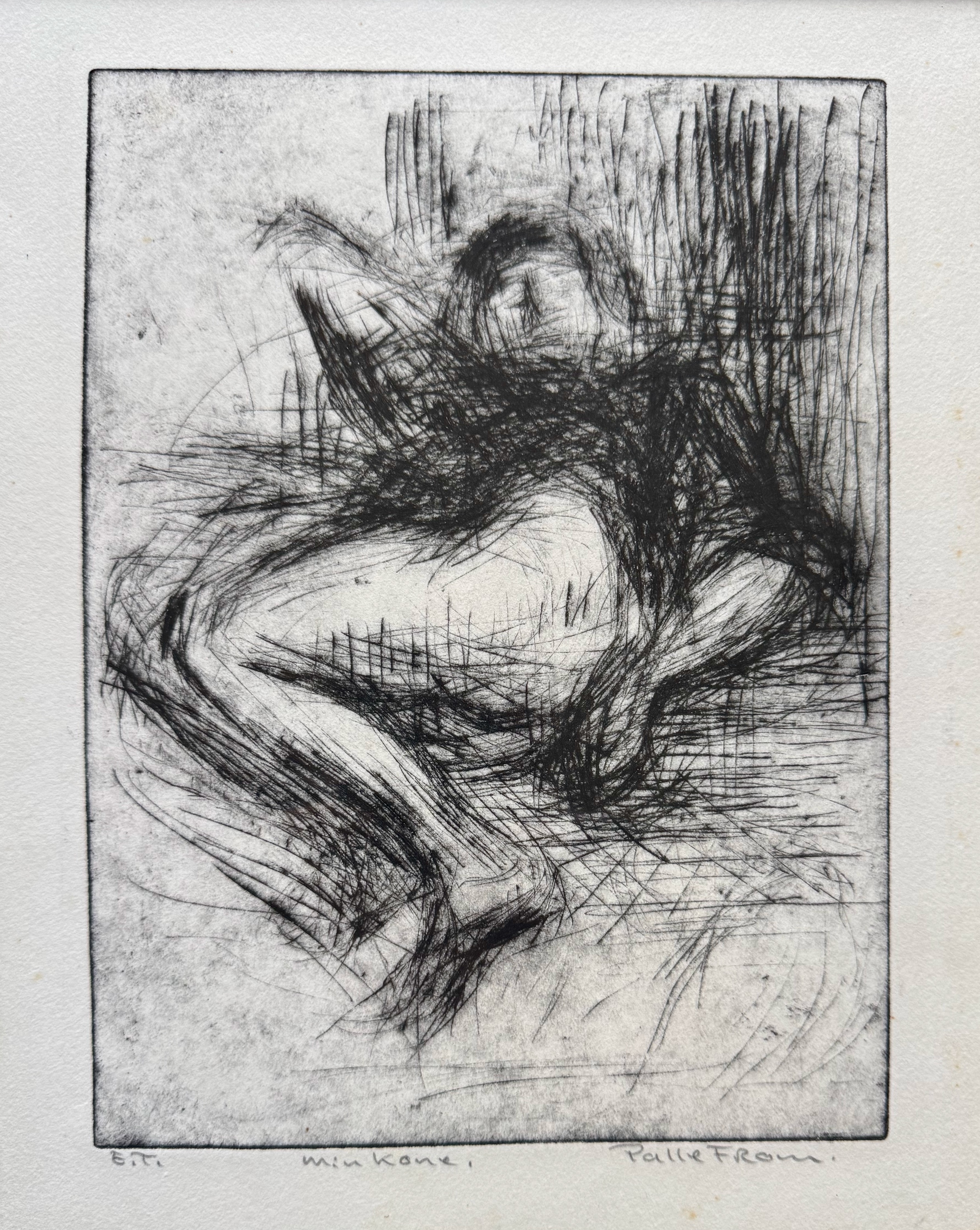 This is an authentic and rare signed print — an exciting discovery: a “model‑study” by a skilled artistic draftsman. Min Kone by Palle From is a wonderful, unusual abstraction of a nude woman, a life‑drawing, studio figure, and original etching fine-art print. Listed Artist: Palle From (Danish, 1935–1993) — Original Drypoint Etching Palle From was a Danish artist born in 1935. His works appear at auction periodically, with prices varying depending on rarity, condition, and subject matter. While his artworks have been offered at numerous auctions over the years, estimates and realized prices vary widely based on demand and quality. Today, few of his works circulate, making this documented piece an unusual discovery with potential future value as his recognition grows. There is no public record of many of his model‑studies or figure works. Although his oeuvre is described as including “portraits and model‑studies,” the publicly archived or auctioned works rarely (if ever) feature documented figure studies or nudes, making this work exceptionally rare. He primarily produced landscapes and reportage-style fine-art prints. Naturalistic but expressive style — the “trembling dark line.” From’s primary technique was cold‑needle drypoint etching, which his biography describes as creating “an intense, expressive naturalism,” often rendered with a “sitrende, mørk streg” (“trembling/dark line”). This combination of realism and expressive line conveys raw honesty — detailed representation without sentimentality, with emotional weight conveyed through stark, vivid line work. A restless, traveling artist in remote and dramatic places. From traveled extensively across Europe and spent extended periods on the Faroe Islands starting in 1965. The rugged landscapes, dramatic coastlines, and remote villages of the Faroe Islands appear repeatedly in his work, giving many of his pieces a moody, isolated atmosphere. Art-world recognition, but relative obscurity. From exhibited since the late 1950s and early 1960s, including in major exhibitions such as local Danish spring/fall shows. He received stipends from institutions like the Statens Kunstfond and Dronning Ingrids Romerske Fond, making him a “hidden gem” in the Danish art scene. Private sale and exhibition history may hold undiscovered works. Many mid‑20th-century Danish exhibitions, small galleries, and regional shows were poorly documented or digitized. It is possible that figure studies, nude works, or experimental prints from From’s career remain unknown to the public, residing in private collections or local archives. From the early 1960s onward, he reportedly carried both a sketchbook and a camera. For some subjects, he drew or etched directly (drypoint/cold-needle); for others, he used photography, especially for spontaneous or documentary-style scenes. He was a traditional studio artist who also responded directly to everyday life. A broad, socially aware range of subjects. While many auctioned works appear to be landscapes or everyday scenes (colony gardens, islands, harbors), his oeuvre also includes “portraits and model-studies, landscapes, and tavern scenes.” From had “a vigilant eye for distinguishing characteristics of a motive, united with social and unflinching empathy,” evident in photographs of people from society’s margins. His focus was on real life — ordinary people, marginal figures — not just idealized scenes. Because of his worldview, travels, and social observations, Palle From is of interest to collectors and historians of Scandinavian graphic and documentary art, beyond the print market. He represents exactly the kind of artist who is undervalued, under-documented, and potentially rich in hidden significance. His combination of: formal training and exhibited works broad subject matter (landscapes, people, social scenes, travel) dual medium (etching + photography) low public exposure makes his work compelling. A well-documented nude or figure study — like the one I own — is particularly rare and meaningful due to scarcity and historical obscurity.