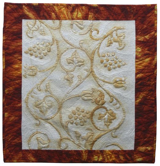 This is a new piece utilizing rust pigmentation and architectural ironwork to create textile artworks. A single piece of ironwork was used three times to create the center panel. It is densely hand stitched around the rust pigmentation to give the piece 3-D relief emphasizing the grapes, vines, and leaves reproduced from the architectural ironwork. The area of flames is hand quilted in a random linear pattern to give the flames visual texture as well. **Currently on loan to US Embassy in Lima, Peru 2018-2021**