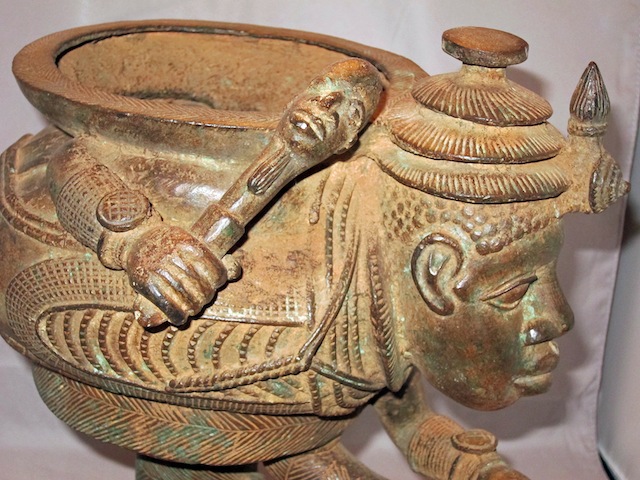This small Yoruba bronze sculpture shows a figure with a tiered headdress wrapped around a vessel positioned on a circular platform of a stool. The figure holds the looped handle of the stool with its left hand and a scepter in its right. Its form relates to stool containers known as apere. The handle may represent an elephant trunk. Although the age is unknown for certain, my source tells me that this is probably from the late 1800's to early 1900's. Awesome detail.