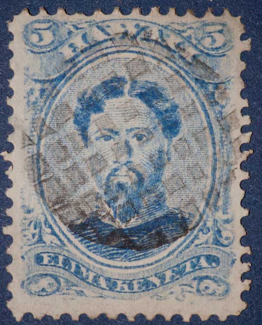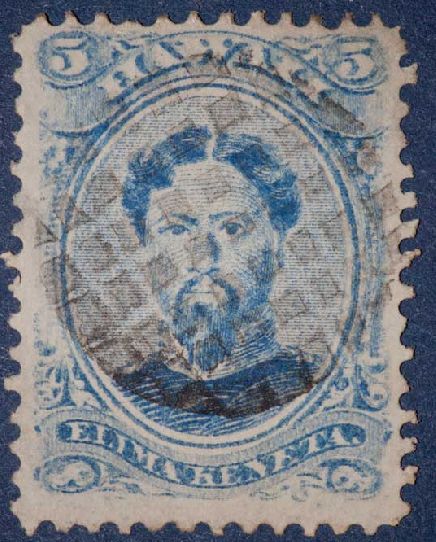 This is a 5 cent stamp produced by the American Banknote Company in 1882. This stamp features King Kamehameha V and is cancelled with a pineapple cancel.