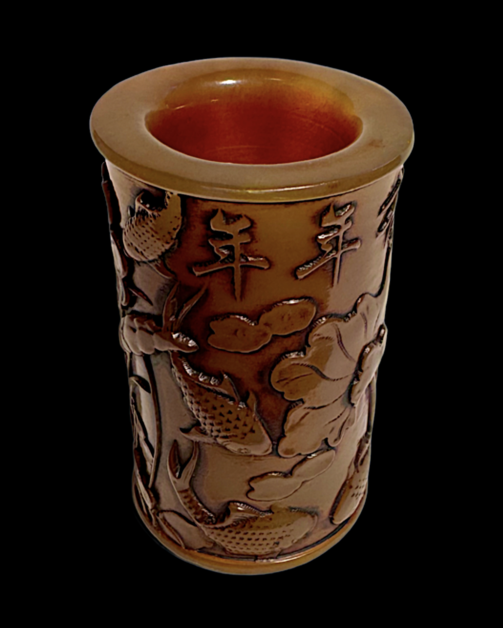Antique hand-carved amber stone jade brush holder. This exquisite piece features finely detailed carvings by a Chinese craftsman depicting carp fish swimming through a watery, beautiful pond...